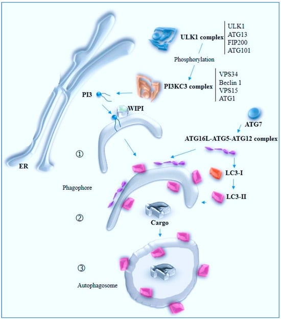 Schematic representation of autophagosome formation The steps are the nucleation of the phagophore (1), its elongation and expansion (2), and its closure (3) to form the double-membrane autophagosome. The ULK complex initiates the process and phosphorylates the PI3KCIII complex, which generates the PI3P lipid-interacting proteins, which recruits proteins such as WIPIs. ATG7 activates ATG12. ATG10 serves as an enzyme transferring ATG12 to ATG5, forming an ATG5–ATG12 conjugate. This conjugate interacts with ATG16L, facilitating its localization to the phagophore. The Atg12–Atg5–Atg16L complex resides on the outer membrane of the phagophore and dissociates from the completed autophagosome. ATG7 also activates LC3, a member of the ATG8 family, which undergoes lipidation, becoming LC3-II, which associates with the phagophore membrane. The LC3-II complex is present on both sides of the phagophore and autophagosome and serves as a marker for autophagosomes and plays a crucial role in cargo recruitment and autophagosome closure. These conjugation systems, thanks to specific enzymes, ensure the proper assembly and expansion of the phagophore.