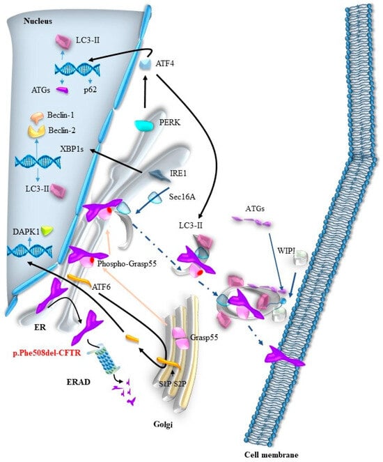 Interestingly, some evidence suggests that p.Phe508del-CFTR can bypass the conventional trafficking pathway and reach the plasma membrane via unconventional protein secretion (UPS), which is a stress-induced pathway [,]. This mechanism involves the Golgi reassembly stacking protein (GRASP55) [,] and likely involves vesicular components associated with secretory autophagy, a non-degradative autophagic process facilitating cargo delivery to the plasma membrane. The secretory autophagic process assembles core autophagic machinery proteins to trap the N-amino terminal leader sequence of proteins by coordinating Golgi re-assembly and stacking proteins (GRASPs), which are biomarkers of secretory autophagy [,]. Unlike canonical autophagy, which primarily degrades intracellular components, secretory autophagy employs core autophagic machinery that can transport p.Phe508del-CFTR. The process is triggered by cellular stressors, including inflammation and ER stress, which activate the unfolded protein response (UPR) to alleviate the protein-folding burden in the ER [].