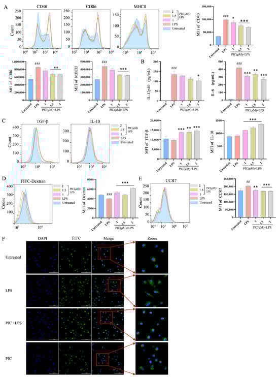 The effects of PIC on LPS-induced DC maturation and function in vitro. DCs were treated with varying doses of PIC in the presence or absence of LPSs and detected by flow cytometry and ELISA: (A) the expression levels of CD40, CD86, and MHC II on the surfaces of DCs; (B) the secretion levels of cytokines IL-12p40 and IL-6; (C) cytokine TGF-β and IL-10 expression; (D) dextran co-cultured with DCs to detect the phagocytosis of antigens; (E) the expression of CCR7 on DC surface; (F) the morphology of DCs under the laser confocal microscope (Scale bar is 100 μm). Statistical significance was noted as ## p < 0.01 and ### p < 0.001 compared to the untreated group, and as * p < 0.05, ** p < 0.01 and *** p < 0.001 compared to the LPS group.