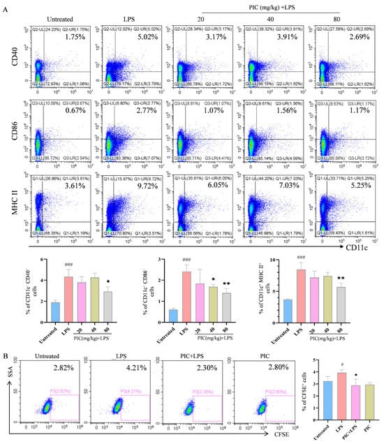 The effects of PIC on the maturation and migration of DCs in vivo. PIC (20, 40, and 80 mg/kg) was mixed with or without LPS and injected into the paws of mice for 24 h: (A) the proportions of CD11c+CD40+, CD11c+CD86+, and CD11c+MHCII+ cells in the lymph nodes of the right legs; (B) the proportions of DCs stained with FITC-CFSE in lymph nodes. # p < 0.05, ### p < 0.001 compared to the untreated group. * p < 0.05 and ** p < 0.0 compared to the LPS group.