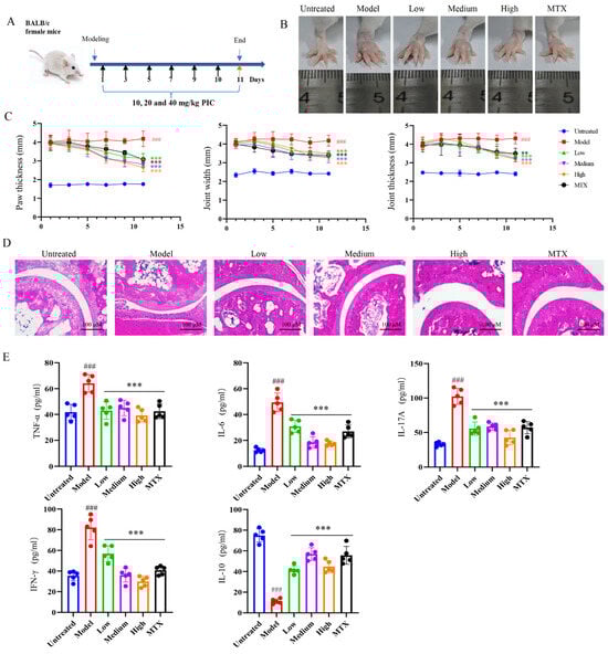 According to the method outlined in Reference [], 30 mice were randomly divided into the untreated, model, methotrexate, and PIC (10, 20, 40 mg/kg) treatment groups. After the emulsification of PBS and CFA at the ratio of 1:1, they were injected into the paws of mice (25 μL/mouse), followed by a booster injection administered after 14 days. After 2 weeks, the mice were treated with PIC or methotrexate every other day, and the treatment was ended on the 11th day. During the treatment period, the joint index and body weight were recorded every other day. Prior to euthanasia, serum was collected through retro-orbital bleeding, and the levels of relevant inflammatory cytokines were determined according to the ELISA kit instructions.