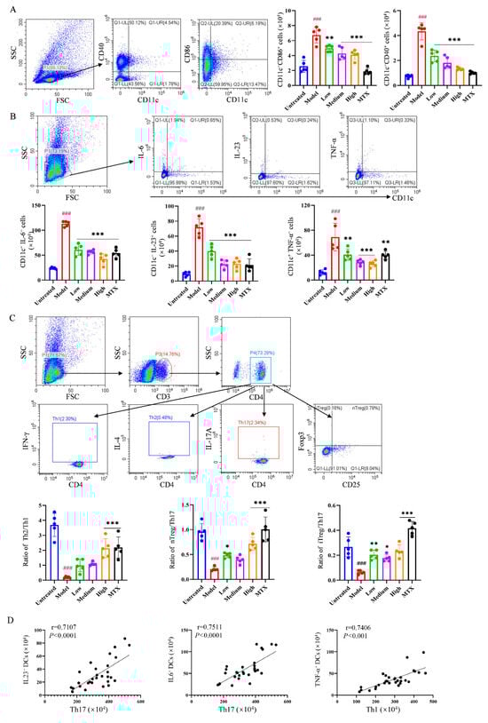 To further reveal the mechanism underlying the relieving effect of PIC on autoinflammatory arthritis, flow cytometry was employed to examine the activation of relevant immune cells in the lymph nodes and spleens of mice. Following PIC treatment, we observed that the number of mature DCs expressing CD40 (CD11c+CD40+) and CD86 (CD11c+CD86+) significantly decreased (p < 0.001) (Figure 4A). In addition, high-dose PIC significantly reduced the levels of TNF-α, IL-23, and IL-6 (p < 0.001) secreted by DCs in the spleens (Figure 4B). Moreover, compared to the model group, high-dose PIC significantly restrained the polarization of CD4+ T cells into Th1 and Th17 cells. It also notably increased the proportion of Th2 cells and promoted the production of inducible regulatory T cells (iTreg) and natural regulatory T cells (nTreg) (p < 0.001) (Figure S3A,B). The ratios of Th2/Th1, nTreg/Th17, and iTreg/Th17 were significantly elevated (p < 0.001) (Figure 4C). Interestingly, in the mouse arthritis model, we found that IL-23 and IL-6 or TNF-α secreted by DCs were positively correlated with Th17 or Th1 cells (p < 0.001) (Figure 4D), indicating that PIC may inhibit the polarization of CD4+ T cells into pro-inflammatory Th1 and Th17 cells by impeding DCs’ production of inflammatory cytokines. Based on these findings, we concluded that PIC can ameliorate foot and joint damage in mice by inhibiting the activation of DCs and regulating the polarization of CD4+ T cells in the spleens of CFA-induced arthritic mice, thereby alleviating inflammation and restoring the immune balance.