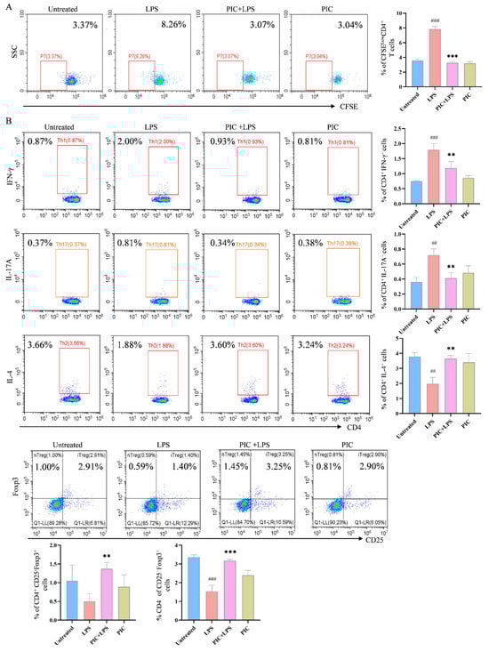 The effect of PIC on the DC-stimulated proliferation of OVA-specific T cells was explored in vitro. In the presence or absence of LPSs, DCs were treated with PIC and then co-cultured with spleen cells from OTII mice for 72 h. After staining with CFSE, it was observed that the DCs co-treated with PIC and LPSs had markedly reduced proportions of CD4+CFSE− T cells compared to the LPS-only group (p < 0.001) (Figure 5A).
