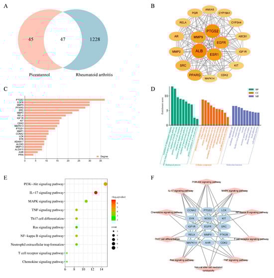 To probe the immunosuppressive mechanism of PIC in the treatment of RA, we employed network pharmacology prediction and molecular docking techniques. Initially, we screened 92 compound targets using the TCMSP database, the Swiss Target Prediction database, and the PharmMapper database. Subsequently, from the DrugBank database and Gene Card database, we retrieved 1334 targets associated with rheumatoid arthritis. By intersecting these targets, we identified a total of 47 cross-targets, which were designated as the key targets of PIC in combating RA (Figure 6A). We then conducted a protein–protein interaction (PPI) network analysis on these key targets, revealing an average degree value of 14.808 and an average clustering coefficient of 0.465. Utilizing the CytoNCA plug-in, we further filtered the targets to retain those exceeding the average degree value, resulting in a total of 19 key targets (Figure 6B,C). In the graphical representation, the sizes and colors of the nodes vary according to their degree values.