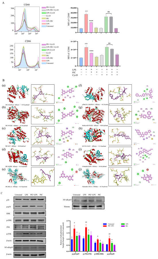 (A) Cytochalasin D inhibits the phagocytosis of DCs by interfering with the polymerization of microfilaments and destroying the dynamic structure of the cytoskeleton. We verified the endocytosis of PIC by DCs with or without cytochalasin D; (B) molecular docking of drugs and targets: (a–e) molecular docking of PIC with MAPK14, PTGS2, KIT, EGFR, and RELA; (f–j) molecular docking between PIC and the corresponding inhibitors for each target; (C) effects of drugs on the MAPK and NF-κB signaling pathways in DCs. Statistical significance is indicated as follows: # p < 0.05, ## p < 0.01, ### p < 0.001 compared to the untreated group; * p < 0.05 and *** p < 0.001 compared to the LPS group, ns compared to LPS and Cy-D group.