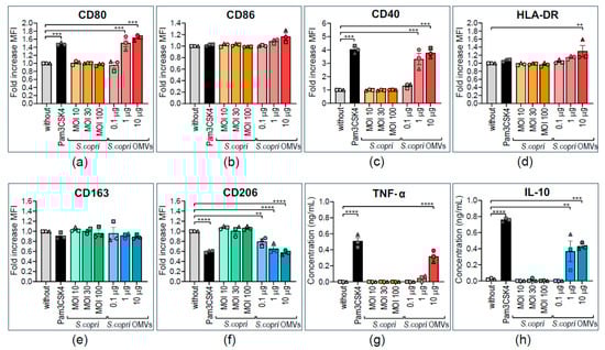To our surprise, THP1-M0 cells stimulated with S. copri did not show any significant alteration (displayed as fold increase in MFI) in the expression of M1-related markers in comparison to the control without stimulus (Figure 2a–d). By contrast, S. copri-derived OMVs, at a concentration of 1 μg/mL and 10 μg/mL, enhanced the expression of CD80 and CD40, but not CD86, and 10 μg/mL OMVs increased HLA-DR expression in relation to the unstimulated control, comparable to the increase observed with Pam3CSK4 (Figure 2a–d). Concerning M2-related markers, S. copri-OMVs, but not the parent bacterium, also decreased CD206 expression, but not CD163, in THP1-M0 (Figure 2e,f). To confirm the M1-like profile induced by S. copri-OMVs, we measured the secretion of the pro-inflammatory cytokine TNF-α and anti-inflammatory IL-10 in culture supernatants of THP1-M0 macrophages by ELISA. THP1-M0 macrophages stimulated with S. copri secreted neither TNF-α nor IL-10 (Figure 2g,h). However, when THP1-M0 macrophages were stimulated with 1 or 10 μg/mL of S. copri-OMVs, an increase in the secretion of TNF-α and IL-10 was observed (Figure 2g,h). This indicates that THP1-M0 macrophages respond to S. copri-OMVs, but not to the parental bacterium, by upregulating the expression of M1 phenotypic markers and M1/M2-related cytokines.