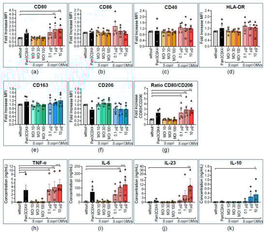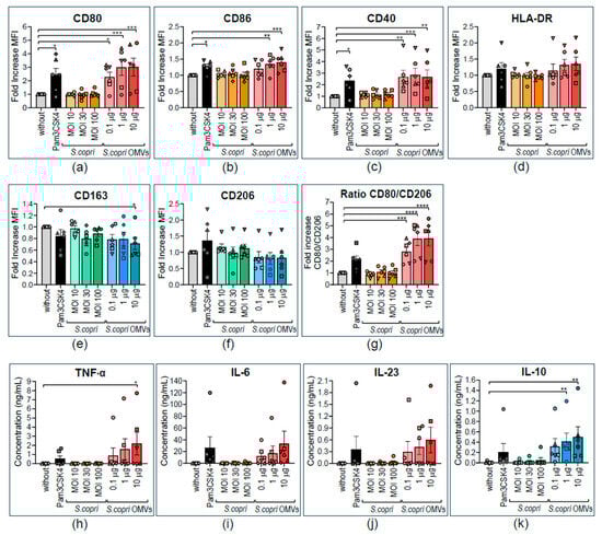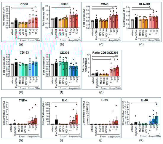 Since macrophages derived from the THP-1 cell line have certain limitations—e.g., low expression levels of CD14, rendering them almost unresponsive to bacterial LPS [], and the requirement of PMA stimulation for macrophage differentiation—we aimed to confirm our results in human macrophages obtained from peripheral blood monocytes of healthy donors. For this purpose, naïve monocyte-derived macrophages (MD-M0) were differentiated by adding M-CSF to the culture media for 8 days. We used the same experimental setting as previously described to determine alterations in the phenotype and cytokine secretion profile of MD-M0 macrophages. We confirmed that neither S. copri nor its OMVs induced cell death in MD-M0 cells (Supplementary Figure S3). Exposure to S. copri did not induce any significant alteration in the expression of M1 markers in MD-M0 macrophages in comparison to unstimulated macrophages (Figure 3a–d), while S. copri-derived OMVs, already at a low concentration at 0.1 μg/mL, enhanced the expression of CD80 and CD40 in MD-M0 by 2.5 to 3 times with respect to the unstimulated control and comparable to the increase observed with the TLR1/2 ligand Pam3CSK4 (Figure 3a,c). Another M1-related marker, CD86, was also increased in MD-M0 macrophages in comparison to the unstimulated control (Figure 3c). However, the expression of HLA-DR was not significantly altered by stimulation with S. copri-derived OMVs (Figure 3d). On the other hand, while S. copri did not alter the expression of M2-related markers CD163 and CD206, S. copri-derived OMVs at 10 μg/mL induced a decrease in CD163 (but not CD206) expression in MD-M0 macrophages (Figure 3e,f). In accordance with the results obtained in THP-1-derived macrophages, we did not observe alterations in the secretion of pro- and anti-inflammatory cytokines by S. copri in MD-M0 (Figure 3h–j). We also did not observe changes in secreted pro-inflammatory IL-6 and IL-23 when MD-M0 were exposed to S. copri-OMVs (Figure 3i,j). By contrast, levels of the proinflammatory cytokine TNF-α and the anti-inflammatory cytokine IL-10 in supernatants of MD-M0 macrophages increased in response to stimulation with S. copri-OMVs (Figure 3h,k).