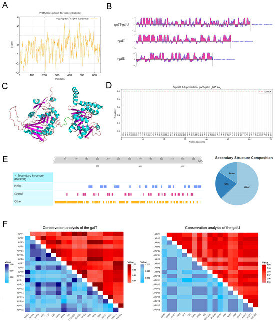 Bioinformatics analysis of rgalT-galU. (A) Hydrophilicity analysis using ProtScale (computational prediction). (B) Antigenicity prediction based on computational modeling using the Jameson–Wolf mathematical model. (C) Structural prediction using SWISS-MODEL (in silico modeling). α-helixes are shown in cyan, β-sheets are in purple, random-coil is in pink, and linker (GGGGS) is in green. (D) Signal peptide analysis using SignalP-6.0 (computational prediction). (E) Structural elements analysis. (F) Heatmap showing conservation analysis of galT and galU based on nucleotide and amino acid sequence alignments. Red represents nucleotide sequence conservation, and blue represents amino acid sequence conservation.