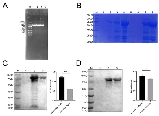 Expression and identification of rgalT-galU. (A) Amplified galU fragment. Line 1–3: galU fragment. Line 4: Negative control. M: Trans2K® DNA Marker (ABclonal Biotechnology Co., Ltd., Wuhan, China). (B) SDS-PAGE analysis of rgalT-galU. M: PageRulerTM Prestained Protein Ladder. Lines 1 and 5: pET28a BL21 (DE3) control. Lines 2 and 6: pET28a-galT-galU BL21 (DE3) without IPTG. Lines 3 and 7: pET28a-galT-galU BL21 (DE3) inclusion body. Lines 4 and 8: pET28a-galT-galU BL21 (DE3) soluble fraction of the cell lysate. (C) Western blotting analysis of galT-galU used His-tag monoclonal antibody. M: PageRulerTM Prestained Protein Ladder. Line 1: pET28a BL21 (DE3) control. Line 2: Unpurified rgalT-galU. Line 3: Purified rgalT-galU. (D) Western blotting analysis of galT-galU used galT-galU polyclonal antibody. M: PageRulerTM Prestained Protein Ladder. Line 1: pET28a BL21 (DE3) control. Line 2: Unpurified rgalT-galU. Line 3: Purified rgalT-galU. ns indicates no significant difference from the control group (p > 0.05); *** p < 0.001.