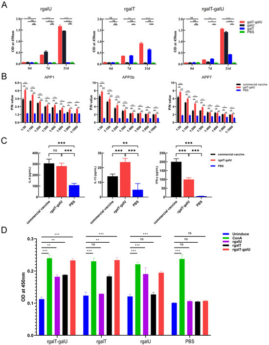 Immunogenicity evaluation of rgalT-galU. (A) Determination of serum IgG level. The IgG level was assessed by an indirect ELISA coated with rgalT, rgalU, and rgalT-galU, respectively. IgG levels were shown as OD values at 450 nm. (B) Determination of serum IgG titer. The IgG titer was assessed by an indirect ELISA coated with APP1, APP5b, and APP7, respectively. IgG titers were shown as P/N values. (C) Detection of IFN-γ, IL-4, and IL-12 in mouse serum. The absorbance was measured at 450 and 570 nm to calculate the cytokine concentration. (D) The splenocyte proliferation assay (n = 3). Levels of proliferation were detected using the CCK8 method, and the results were absorbance at 450 nm. Data are represented as mean ± SD. ns indicates no significant difference from the control group (p > 0.05); * p < 0.05, ** p < 0.01, *** p < 0.001.
