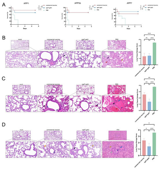 Animal survival rates and lung histopathological analysis in mice. (A) Survival rates of mice within 7 days following challenge with APP1, APP5b, and APP7, respectively (n = 7 mice per group). (B–D) Pathological observations of lung tissue in mice following challenges with APP1, APP5b, and APP7, respectively. Smaller images are shown at a lower magnification (100×), while larger images are shown at a higher magnification (200×). Black arrows indicate inflammatory cell infiltration, blue arrows indicate necrotic and detached epithelial cells, purple arrows indicate eosinophilic substances, green arrows indicate tissue exudates, yellow arrows indicate hemorrhage, and red arrows indicate congestion. Lung tissue damage scores (shown in Figure 4B–D) were derived from these parameters using the standardized scoring system described in the Methods Section. Data are represented as mean ± SD. n = 3. ns indicates no significant difference from the control group (p > 0.05); * p < 0.05, ** p < 0.01, *** p < 0.001.