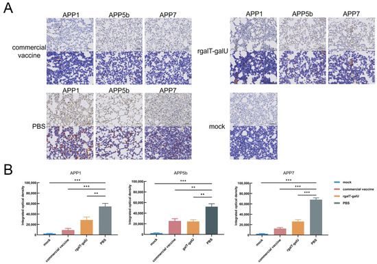 After challenging mice with APP1, APP5b, and APP7, we assessed lung neutrophil infiltration using immunohistochemistry (Figure 5A). In the PBS group, the IOD values were 5.4 × 104, 5.2 × 104, and 6.8 × 104, indicating pronounced neutrophil infiltration. The commercial vaccine group displayed IOD values of 9 × 103, 2.5 × 104, and 1.2 × 104, significantly reducing pulmonary inflammation. The rgalT-galU-immunized mice had IOD values of 2.8 × 104, 2.4 × 104, and 2.6 × 104 (Figure 5B). Neutrophil infiltration in the rgalT-galU-immunized lung tissue was reduced compared to the PBS group. Although the reduction was less marked than in the commercial vaccine group, rgalT-galU provided notable protection, effectively mitigating pulmonary inflammation.
