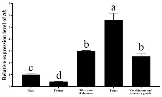 We had assayed the spatiotemporal expression of ttk in N. lugens, and found no significant difference in ttk expression levels between males and females at the fourth instar nymph stage. However, marked differences were observed in fifth instar nymphs and adults. The expression of ttk in the abdomen was significantly higher than in the head and thorax across fourth and fifth instar nymphs and adults []. To address the lack of data on ttk expression in male reproductive organs, we dissected the abdomen of newly emerged male adults into testes (as a sample), accessory glands and vas deferens (as a sample), and remaining abdominal tissues as a sample. Quantitative RT-PCR revealed that ttk expression in the male abdomen was significantly higher than in the head or thorax within 24 h post-emergence (Figure 1). Specifically, testicular ttk expression was 2.21-fold higher than in the vas deferens and accessory glands, and 1.89-fold higher than in other abdominal tissues, indicating predominant ttk expression in the testes.