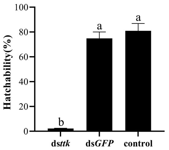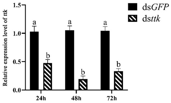 RNAi efficiency of dsttk in fourth-instar male nymphs. Data are expressed as mean ± SD (n = 15), and the analysis method is two-tailed Student’s t test. The different lowercase letters show significant difference (p < 0.05).