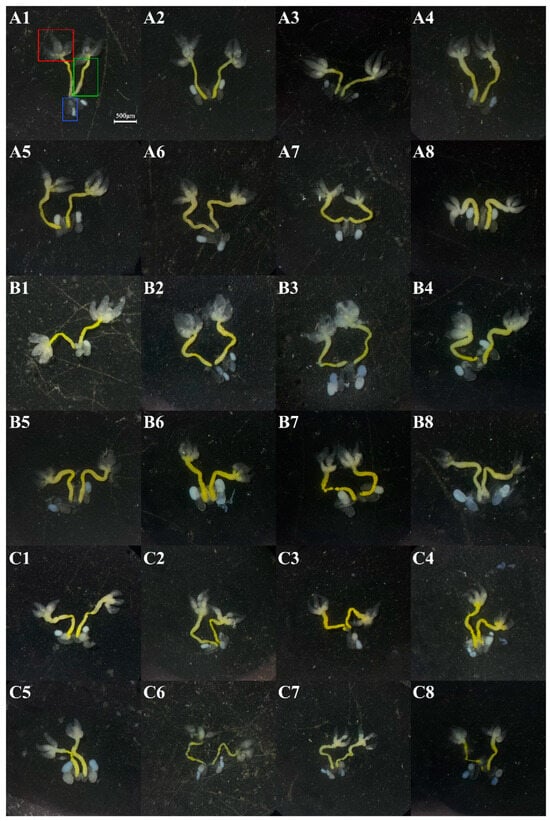 The reproductive glands of male adults grown from fourth-instar nymphs with different treatments. (A1–A8) showed the reproductive glands from adults grown from untreated fourth-instar nymphs on day 1 to 8 post-eclosion. (B1–B8) showed the reproductive glands of adults grown from fourth-instar nymphs treated with dsGFP on day 1 to 8 post-eclosion. (C1–C8) showed the reproductive glands of adults grown from fourth-instar nymphs treated with dsttk on day 1 to 8 post-eclosion. Boxes: testes (red), vas deferens (green), and accessory glands (blue). Scale bar: 500 μm.