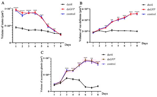 Testes volume in dsttk-injected males remained significantly reduced (46.4–75.7% of the dsGFP control) throughout days 1–7 post-eclosion (Figure 5A). While dsGFP-treated individuals showed a normal 76.2% testicular volume reduction (from 9.7 × 106 μm3 to 2.3 × 106 μm3), dsttk-injected specimens exhibited complete developmental arrest with minimal volumetric changes.