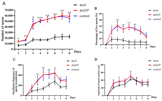 During days 3–8 post-eclosion, sperm motility frequency in dsttk-treated males was persistently reduced (36.8–66.4% lower than dsGFP controls; p < 0.01; Figure 6C). Notably, this impairment was temporally specific, as sperm motility amplitude remained comparable between groups (Figure 6D).