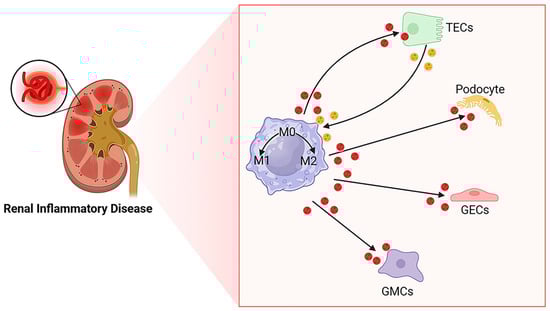 Extracellular vesicles (EVs) are a group of small membrane particles released by cells into the extracellular space, consisting of proteins, lipids, and nucleic acids [8]. EVs can be used as biologically active carriers to carry a variety of goods, with proteins (including various receptors and signaling molecules) and nucleic acids embedded on their surfaces, which can participate in complex intercellular communication, molecular transfer, and gene expression [9]. Extracellular vesicles can act as tools and targets in therapy for diseases. EVs can be classified into apoptotic bodies, microvesicles, and exosomes based on their sources, characteristics, and release mechanisms. Apoptotic bodies are a byproduct of programmed cell death, released by encapsulating cell fragments during apoptosis [10]. Considering their limited application in disease models, apoptotic bodies will not be considered here [11]. The last two types of vesicles are most worthy of in-depth research due to their biological characteristics, important physiological functions, and clinical therapeutic significance [12]. Microvesicles originate from the plasma membrane, ranging in size from 50 to 1000 nm, and are secreted directly through extracellular phagocytosis without involving the cell membrane [13]. Exosomes are nanoscale extracellular vesicles, typically measuring 40–100 nm in diameter [14], and encapsulated by a lipid bilayer [15]. They come from various living cells [16] and are stable in several body fluids, including urine, prostate fluid, semen, and bile [17]. Exosomes transport a broad range of biological macromolecules [18] such as RNAs and proteins, modulating the pathophysiology of recipient cells by releasing these molecules into the extracellular space, initiating signaling and downstream transport [19]. As intercellular signaling mediators, exosomes play a crucial role in communication between macrophages and kidney cells [20,21,22]. Due to the use of EVs to study the pathophysiological mechanisms of renal inflammation, efforts have been focused on exosomes as biomarkers and signaling molecule carriers for therapeutic applications. In this review, we will particularly emphasize exosomes. However, the exact differences between these different vesicle groups are still controversial, so in appropriate circumstances, EV names are preferred. Based on this, we discussed the interaction between macrophages and kidney cells in the occurrence and development of renal inflammatory diseases, the mechanism of EV regulation, and the potential application of EVs as therapeutic targets.