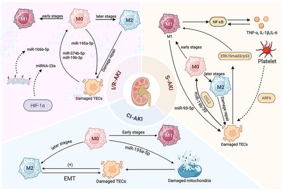 At the onset of I/R-AKI, TECs not only suffer passive damage but also produce multiple chemokines and cytokines [47] that recruit M1-type macrophages to the kidney interstitium. These macrophages, upon recognizing damage-associated molecular patterns through their pattern recognition receptors (PRR), activate non-infectious inflammation, further worsening kidney damage [39]. This process results in a cycle of inflammation and kidney injury. During the repair phase, TECs may induce a switch in macrophages to the M2-type, which aids in clearing inflammation and repairing renal tubules [48,49], highlighting the key in TEC-macrophage crosstalk in the development of AKI.