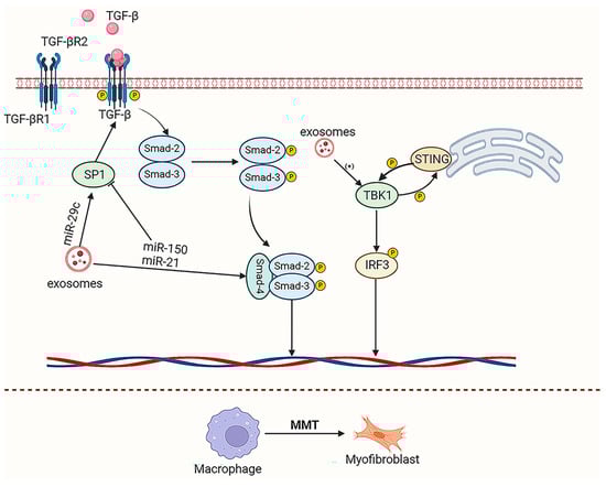 In addition to inducing fibroblast recruitment, proliferation, and activation that indirectly promote fibrosis, macrophages can directly contribute to fibrosis through macrophage–myofibroblast transformation (MMT) [127,128]. After kidney injury onset, macrophages infiltrate the kidney and differentiate into M2-type macrophages in response to inflammation, which then transforms into myofibroblasts. This transformation, coupled with an increase in ECM synthesis, drives the progression of kidney fibrosis, known as MMT [128]. In the late stage of kidney injury, M2-type macrophages predominantly promote the repair of epithelial and vascular endothelial cells. However, incomplete repair can trigger the transdifferentiation of M2-type macrophages, leading to fibrosis [7]. These macrophages stimulate myofibroblast proliferation through IL-10 and TGF-β secretion, contributing to late-stage fibrosis [129]. MMT plays a crucial role in renal fibrosis through various mechanisms, including the transforming growth factor-β 1 (TGF-β 1)/Smad3 signaling pathway and natural killer T cell (NKT)/IL-4 signaling pathway, as well as the adiponectin/APK pathway and ALD/MR/TGF-β 1 signaling pathway [130,131]. The levels of TGF-β signaling are crucial for inducing polarized M2-type macrophage subtypes. Superfluous TGF-β activation triggers MMT in M2a macrophages, TGF-β binds to the TGF-β receptor complex, phosphorylates the Smad family complex, and finally activates the Src-centered gene network in bone marrow-derived macrophages to promote MMT process. However, moderate levels of stimulation enhance the anti-inflammatory response associated with M2c macrophage differentiation. The regulation of the TGF-β levels and ATF6/TGF-β/Smad3 signaling axis in macrophages can direct their polarization towards the M2c phenotype [7]. Activated NKT cells produce excess IL-4, which then binds to IL-4 receptor alpha and triggers JAK3/STAT6 signaling to enhance myofibroblast transformation. Research has found that NETs formed by neutrophils stimulate the secretion of TNF-α and TGF-β 1 by macrophages by triggering the translocation of NF-κ B p65 subunit to the nucleus, and then promoting MMT by activating the TGF-β 1/Smad pathway in macrophages [132]. Under the regulation of extracellular vesicles, MMT plays a role in kidney fibrosis via TGF-β1/Smad3 and STING/TBK1 signaling pathways [130,131] (Figure 3).
