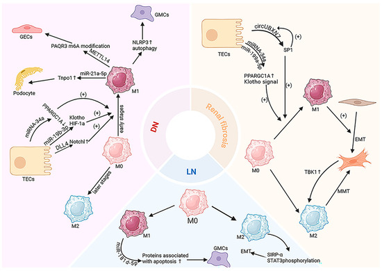 (3) In DN, macrophages are conclusively shown to promote podocyte injury and apoptosis. In the early stages of DN, the functional and structural impairment of podocytes leads to podocyte apoptosis and detachment, resulting in disruption of the integrity of the glomerular filtration barrier [159]. It has been reported that more than 20% depletion of podocytes can cause impairment of glomerular function. As glomerular disease progresses in diabetes, podocytes can be detected increasingly in the urine. This indicates that the loss of podocytes in this condition is linked to the advancement of glomerular disease [160]. Therefore, investigating podocyte depletion provides strong support for understanding the pathogenesis of DN. In DN, the macrophage-derived EVs miR-21-5p promotes podocyte injury by enhancing pyroptosis through tumor necrosis factor α-inducible protein 3 [161]. Zhuang found that EVs secreted by M1-type macrophages reduce cell proliferation by upregulating miR-21a-5p targeting the Tnpo1 gene and increasing apoptosis, thereby exacerbating high glucose-induced podocyte injury [162].