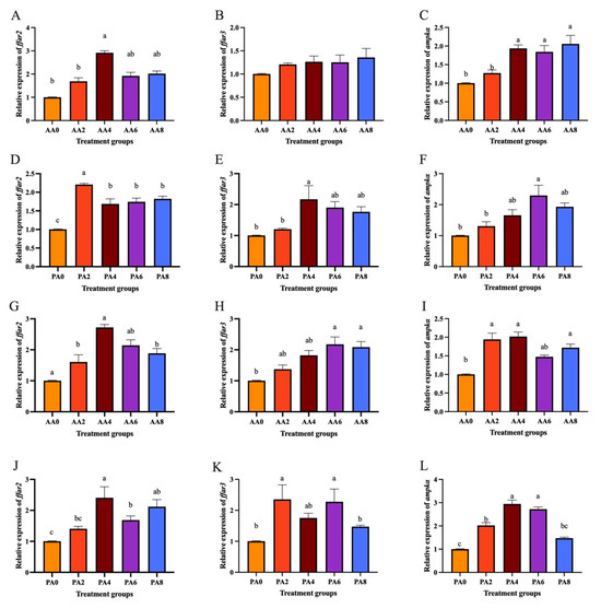 2.6. Expression of ffar2, ffar3, and ampkα Treated with SCFAs and High Glucose and Lipid in Hepatocytes of C. nasus