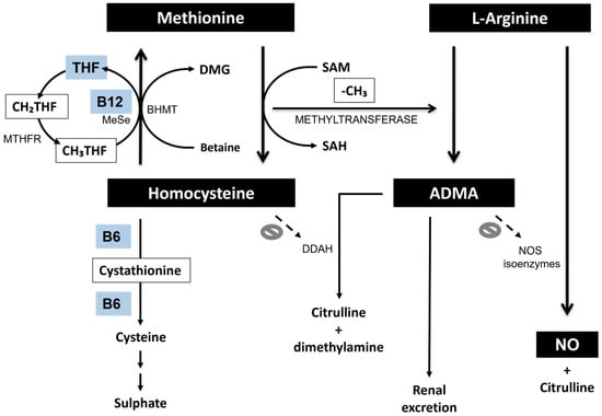 - Schmitt, B.; Wolters, M.; Kressel, G.; Hülsmann, O.; Ströhle, A.; Kühn-Velten, W.N.; Lichtinghagen, R.; Bub, A.; Barth, S.W.; Stichtenoth, D.O.; et al. Effects of Combined Supplementation with B Vitamins and Antioxidants on Plasma Levels of Asymmetric Dimethylarginine (ADMA) in Subjects with Elevated Risk for Cardiovascular Disease. Atherosclerosis 2007, 193, 168–176. [Google Scholar] [CrossRef]