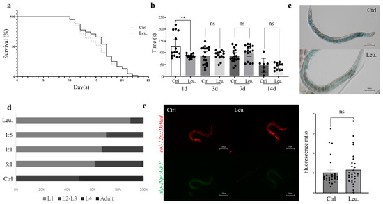 For the preparation of mixed bacterial suspensions, 50 μL of Escherichia coli OP50 and 50 μL of Leucobacter sp. were combined at ratios of 1:5, 1:1, and 5:1. A total of 100 μL of the resulting mixture was then spread uniformly onto NGM plates.