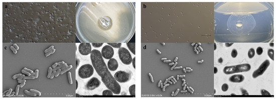 HNU-1 exhibits a distinct growth pattern, characterized by an initial lag phase lasting from 0 to 9 h, followed by a logarithmic growth phase commencing at 9 h, and culminating in the stationary phase at 25 h (Figure S1). HNU-1 can grow at both 28 °C and 37 °C, with optimal growth observed at 37 °C. Morphologically, HNU-1 is a short, rod-shaped bacterium that does not produce spores. It grows slowly on conventional media, forming smooth, regular colonies with well-defined edges and hydrophobic properties (Figure 2a–d).