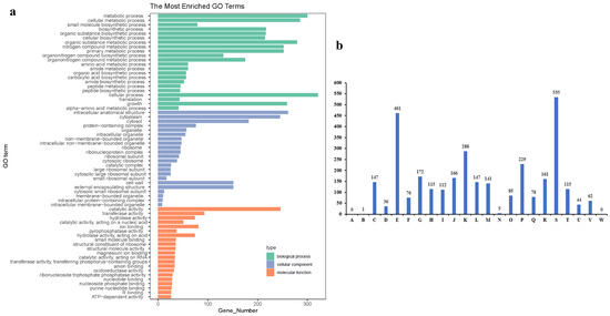 Gene enrichment analysis of the HNU-1 genome. (a) GO functional classification of Leucobacter sp. HNU-1. The x-axis represents the number of genes, the y-axis represents the GO term, and different colors are used to distinguish biological processes, cell components, and molecular functions. (b) COG functional annotation classification of Leucobacter sp. HNU-1 A: RNA processing and modification; B: energy production and conversion; C: cell cycle control, cell division, and chromosome partitioning; D: amino acid transport and metabolism; E: nucleotide transport and metabolism; F: carbohydrate transport and metabolism; G: coenzyme transport and metabolism; H: lipid transport and metabolism; I: translation, ribosomal structure, and biogenesis; J: transcription; K: replication, recombination, and repair; L: cell wall/membrane/envelope biogenesis; M: cell motility; N: posttranslational modification, protein turnover, and chaperones; O: inorganic ion transport and metabolism; P: secondary metabolite biosynthesis, transport, and catabolism; Q: general function prediction only; R: function unknown; S: signal transduction mechanisms; T: intracellular trafficking, secretion, and vesicular transport; U: defense mechanisms; V: extracellular structures; W: mobilome: prophages and transposons.