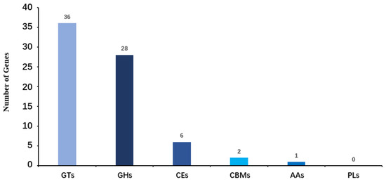 In addition, two genes were identified as encoding carbohydrate-binding modules (CBMs), which are often associated with other enzyme domains and play a critical role in recognizing and binding specific carbohydrate substrates. Six genes were assigned to the carbohydrate esterase (CEs) family, enzymes that act on ester linkages within carbohydrates, contributing to their structural modification. One gene was annotated as an auxiliary activity enzyme (AAs), which typically supports oxidative breakdown of polysaccharides and other carbohydrate polymers.