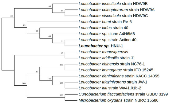 Phylogenetic placement of HNU-1 among related bacteria. The phylogenetic tree was reconstructed based on the 16S rDNA genomes of 15 strains belonging to the genus Leucobacter. Curtobacterium flaccumfaciens strain GBBC 3199 and Microbacterium oxydans strain NBRC 15586 were designated as outgroups.