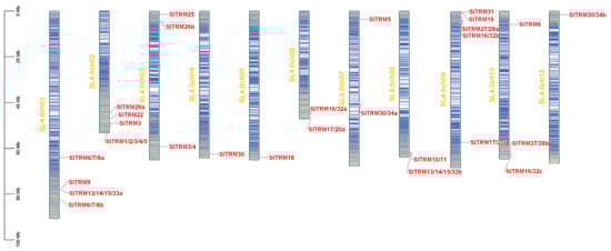 The position of SlTRM gene family members on chromosomes. A scale of 0 MB to 100 MB, representing the length of the chromosome. The yellow font indicates the number of chromosomes, arranged sequentially from left to right, while the line segments transitioning from blue to red on the chromosomes depict the density of genes.