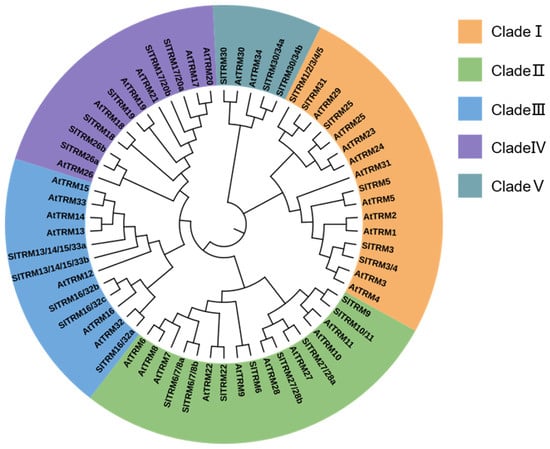 To investigate the phylogenetic relationships of the tomato SlTRM gene, we selected 34 Arabidopsis AtTRM protein sequences and 28 tomato SlTRM protein sequences for the construction of phylogenetic trees. The results indicated that the phylogenetic trees were categorized into five subfamilies (I, II, III, IV, V), with both tomato and Arabidopsis TRM proteins distributed across each subfamily (Figure 2). Among the groups, clade I and II members comprise up to seventeen and sixteen proteins, respectively, while subgroup IV contains the fewest genes, comprising only five proteins (AtTRM30, SlTRM30, AtTRM34, SlTRM30/34a, and SlTRM30/34b). In summary, the tomato and SlTRM members of the AtTRM family in Arabidopsis are closely related and exhibit relatively conserved evolutionary relationships. Research in Arabidopsis has established distinct functions for TRM family members: AtTRM5 modulates leaf morphogenesis through microtubule reorganization, AtTRM7 regulates cell division patterns, and AtTRM21 participates in flavonoid biosynthesis. Based on these evolutionarily conserved mechanisms, we hypothesize that their tomato orthologs may maintain analogous functions in growth regulation and metabolic pathways. These findings provide critical insights into TRM-mediated developmental processes in tomato and establish a foundation for the future functional characterization of this gene family [,,].