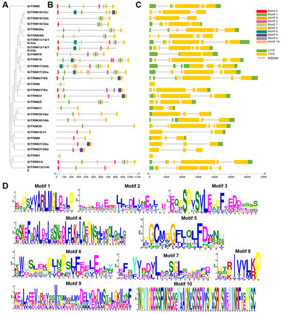 Gene structure and conserved motifs of SlTRM gene family members. (A) Phylogenetic tree depicting the relationships among SlTRM gene family members. (B) Distribution of conserved motifs within the SlTRM gene family, with different colors representing distinct conserved motifs. (C) Gene structure of SlTRM gene family members, where green indicates the UTR region, yellow denotes the CDS region, and horizontal lines represent the intron regions. (D) The amino acid sequences of the conserved motifs in SlTRM gene family members, with base size reflecting the frequency of occurrence.