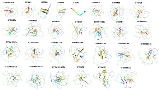 Three-dimensional structure prediction of SlTRM gene family members. Different color depths represent confidence, with increasing confidence from blue to red.