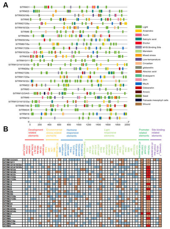 The cis elements in the promoter regions of tomato SlTRMs. (A) The distribution of cis-acting elements within the gene, with different colors indicating distinct elements. (B) Statistical analysis of the cis-acting components. The number in the grid represents the number of elements, and the color from blue to red represents the number of elements from fewer to more.