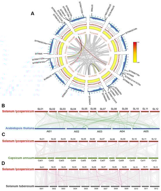 Intra and interspecies collinear analysis of the SlTRM gene family members. (A) Advanced circuit diagram of the SlTRM gene family members; gray lines represent all collinear genes in the tomato genome, while red, black, and yellow lines denote the SlTRM genes with collinear relationships. The yellow circle indicates gene density, the red curve illustrates GC content, and the blue curve range represents the N ratio. (B–D) Interspecies collinear analysis among Solanum lycopersicum, Arabidopsis thaliana, Solanum tuberosum, and Capsicum annuum. The gray lines depict the collinear relationships between other genes in the genome, whereas red, green, and pink lines represent the collinear relationships among TRM genes, respectively.