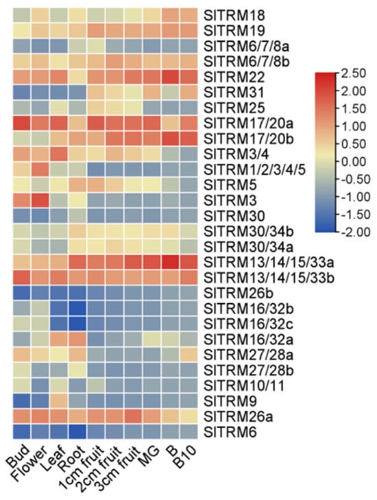 We observed the expression of 28 genes across different tissues, with the majority being expressed in all examined tissues (Figure 7). Notably, SlTRM13/14/15/33a, SlTRM17/20a, SlTRM17/20b, and SlTRM22 exhibited high expression levels in fruit, whereas SlTRM16/32b, SlTRM16/32c, and SlTRM26b demonstrated very low expression levels across all tissues. Additionally, SlTRM6 was not expressed in any tissue. Interestingly, most genes showed higher expression levels in fruit tissues compared to other tissues, suggesting a potential role in regulating fruit development (Table S3).