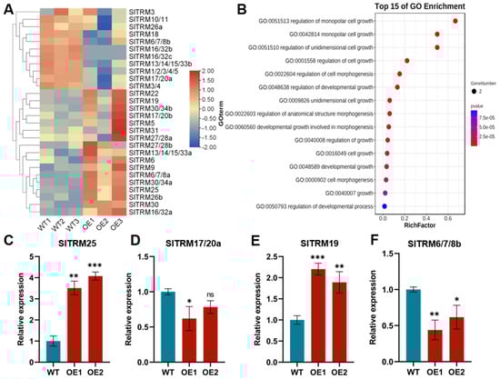 Analysis of the expression and Gene Ontology (GO) enrichment of the SlTRM gene in lateral developmental transcription. (A) Expression levels of the SlTRM gene in the lateral developmental transcriptome are presented, where WT denotes wild type and OE indicates overexpressed lines. The color coding is as follows: blue represents low-level expression, while red indicates high-level expression. (B) GO enrichment analysis of the SlTRM gene family members is illustrated, with blue and red denoting enriched p values. (C–F) The expression of the tomato SlTRM gene in both wild-type and overexpressed plants was analyzed using qRT-PCR. Asterisks indicate significant differences determined by one-way ANOVA (ns ≥ 0.05, * p < 0.05, ** p < 0.01, *** p < 0.001).