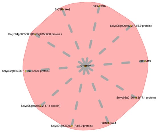 We conducted an interaction network prediction for SlTRM25 using the STRING platform, which revealed that ten genes interact with SlTRM25 (Figure 9). In addition to four unknown proteins, these include the delayed flowering gene SlFAF3/4b, the tomato fruit development genes SlCSR-like1 and SlCSR-like2, the heat-stress-related gene Solyc02g085030, and the negative regulatory gene SlTRM19, which controls fruit elongation. Based on the preliminary data from our research group, we discovered that SlTRM25 exhibits a similar expression pattern to known regulators of lateral branch development (BL, BRC1b, and PIN4), showing upregulation in overexpression lines []. These genes have been shown to exert varying degrees of influence on tomato growth and development. In summary, we propose that SlTRM25 may play a role in regulating the development of lateral branches and the shape of tomato fruit.
