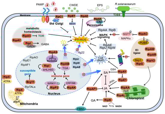 Other effectors, such as RipC1, RipAE, RipU, and RipW, were also reported to strongly suppress PTI-triggered ROS burst []. Among them, RipU locates in the nucleus, RipAE is found in the nucleus and on the plasma membrane, RipC1 locates on the PM and in the Golgi apparatus, and RipW is associated with the nucleus and the ER. It is worth mentioning that three of them, RipAE, RipU, and RipW, were found to induce cell death and influence mitogen-activated protein kinase (MAPK) cascades, while RipAE and RipW interfered with the SA and JA pathways, respectively []. The study suggests that the T3Es involved in disturbing ROS homeostasis are located in diverse subcellular locations.