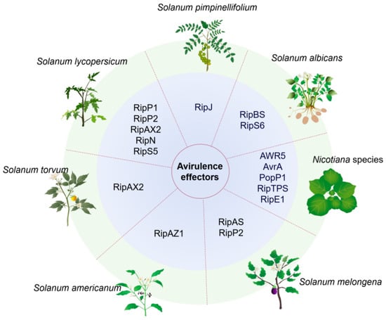 Along with the development of genomic techniques, the identification of avirulent effectors could also be conducted through a comparative analysis between resistant and susceptible genotypes or between avirulent strains and virulent strains to a specific plant species. Five core effectors, namely RipE1, RipH2, RipV1, RipV2, and RipX, which are secreted by R. solanacearum race 3 biovar 2 (R3bv2), were reported to trigger substantially stronger cell death in the resistant eggplant genotype MM853 than in the susceptible genotype MM738 []. It was thus speculated that the eggplant genotype MM853 may harbor R genes that recognize one or more of these core effectors. A study compared the virulence of R. solanacearum strains HA4-1 and HZAU091 in the wild potato Solanum albicans 28-1 (ALB28-1) []. It was found that HZAU091, but not HA4-1, was virulent to the wild potato. Several distinct T3Es between HZAU091 and HA4-1A were then identified by a comparative genomic analysis. Among them, RipBS and RipS6 from HA4-1 were found to significantly reduce the virulence of HZAU091 to wild potato and induce a hypersensitive response (HR) in leaf tissue []. This study further demonstrates that analysis on the T3Es present in avirulent strains can offer a useful approach to identify core avirulent effectors for plants that lack well-known resistance resources.