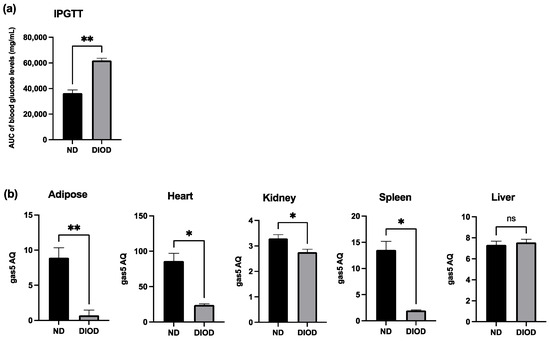 DIOD impairs glucose tolerance and downregulates gas5 expression in multiple tissues. (a) Intraperitoneal Glucose Tolerance Test (IPGTT) in ND and DIOD C57BL/6J mice after an 8 h fast followed by intraperitoneal glucose injection (2 g/kg body weight). The area under the curve (AUC) was calculated to quantify glucose exposure over time using the trapezoidal rule, following the formula: AUC (mmol/L*min) = 1/2 × (BG 0 min + BG 30 min) × 30 min + 1/2 × (BG 30 min + BG 60 min) × 30 min + 1/2 × (BG 60 min + BG 90 min) × 30 + 1/2 × (BG 90 min + BG 120 min) × 30 min, where BG represents blood glucose values at each respective time point. A statistical analysis was performed in GraphPad Prism using an unpaired t-test. The data are presented as mean ± SEM; n = 3 per group; ** p < 0.01. (b) Total RNA was extracted from the adipose tissue of the ND and DIOD mice (n = 3 per group). Real-time qPCR was performed in triplicate using SYBR Green to measure the absolute quantification of gas5 expression and normalized to GAPDH. A statistical analysis was performed in GraphPad Prism using unpaired t-test. The data are presented as mean ± SEM; n = 3 per group; * p < 0.05, ** p < 0.01; ns = not significant.