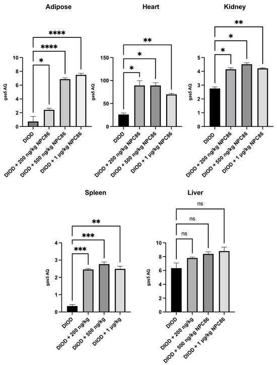 Total RNA was extracted from the kidney, spleen, heart, adipose, and liver tissues of DIOD and DIOD + NPC86 (200 ng/kg, 500 ng/kg, or 1 μg/kg) mice. Real-time qPCR was performed in triplicate using SYBR Green to measure the absolute quantification of gas5 expression and normalized to GAPDH. A statistical analysis was performed using a one-way ANOVA in GraphPad Prism. The data are presented as mean ± SEM; n = 3 per group; * p < 0.05, ** p < 0.01, *** p < 0.001 **** p < 0.0001; ns = not significant.
