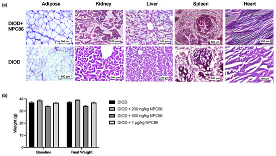 NPC86 treatment shows no signs of toxicity and does not alter body weight. (a) Representative hematoxylin and eosin (H&E)-stained sections of adipose, kidney, liver, spleen, and heart tissues from DIOD mice (bottom row) and NPC86-treated (500 ng/kg b.w.) DIOD mice (top row). (b) Body weight was measured at baseline and following a 5-day treatment regime with NPC86 treatment (200 ng/kg, 500 ng/kg, and 1 µg/kg) in DIOD mice. A statistical analysis was performed in GraphPad Prism using paired t-test. The data are presented as mean ± SEM; n = 3 per group.