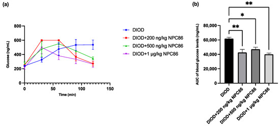 NPC86 improves glucose clearance in DIOD mice. (a) Blood glucose levels were measured during an intraperitoneal glucose tolerance test (IPGTT) following an 8 h fasting period. The mice received an intraperitoneal injection of D-glucose (2 g/kg body weight), and blood glucose levels were recorded at 0, 30, 60, 90, and 120 min post-injection. Data are presented as mean ± SEM (n = 3 per group). (b) The area under the curve (AUC) was calculated to quantify glucose exposure over time using the trapezoidal rule, following the formula: AUC (mmol/L*min) = 1/2 × (BG 0 min + BG 30 min) × 30 min + 1/2 × (BG 30 min + BG 60 min) × 30 min + 1/2 × (BG 60 min + BG 90 min) × 30 + 1/2 × (BG 90 min + BG 120 min) × 30 min, where BG represents blood glucose values at each respective time point. Statistical comparisons between groups were performed using one-way ANOVA, n = 3 per group. Statistical significance is indicated as * p < 0.05 and ** p < 0.01.