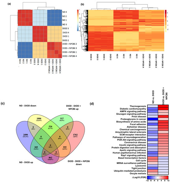 Distance heatmap, hierarchical clustering, differential gene expression, and pathway enrichment analysis of RNAseq data. (a) Distance heatmap showing the correlation of samples within their respective groups. The color scale ranges from blue (low correlation) to red (high correlation), with hierarchical clustering applied to group samples with similar transcriptomic signatures. (b) Hierarchical clustering heatmap of differentially expressed genes across experimental conditions. Rows represent genes, and columns represent individual samples. The expression values are Z-score-normalized, with red indicating upregulation and yellow indicating downregulation. The clustering demonstrates that the NPC86-treated (500 ng/kg b.w. and 1 μg/kg b.w.) DIOD mice exhibit a gene expression profile distinct from that of the untreated DIOD mice and more closely aligned with that of the ND controls, suggesting that NPC86 treatment reprograms the transcriptome toward a metabolically healthier state. (c) Venn diagram illustrating the overlap of differentially expressed genes (DEGs) among the experimental groups. The analysis shows that 1006 genes were downregulated in the DIOD mice compared to in the ND controls, while NPC86 treatment (500 ng/kg b.w. and 1 μg/kg b.w.) upregulated 517 genes, indicating a partial reversal of DIOD-associated transcriptional changes. Additionally, 555 genes that were upregulated in the DIOD mice compared to the ND controls were significantly downregulated following NPC86 treatment. A total of 534 genes overlapped between the groups, representing core transcriptional changes induced by NPC86 to promote metabolic balance. (d) Pathway enrichment heatmap displaying differentially regulated metabolic, inflammatory, and signaling pathways across experimental groups. The color scale represents log-transformed false discovery rate (FDR) −adjusted p-values, indicating pathway significance. Key metabolic pathways such as insulin signaling, AMPK signaling, and the biosynthesis of amino acids were enriched, suggesting that NPC86 plays a role in restoring metabolic homeostasis in DIOD mice.