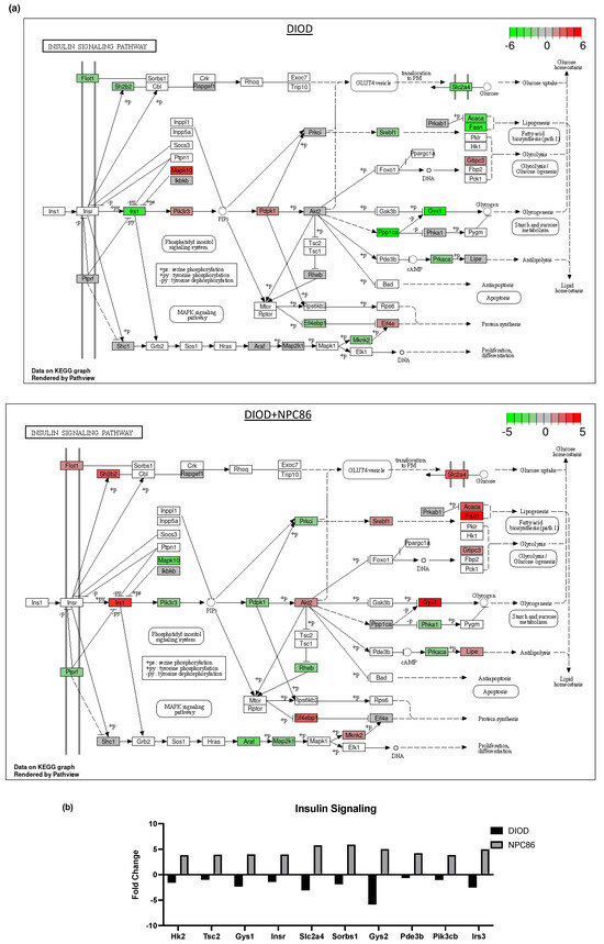 These changes aligned with the improvements in insulin sensitivity and metabolic homeostasis. NPC86 treatment reversed the downregulation of insulin signaling (Figure 6a), PI3K-Akt signaling, and AMPK pathways observed in DIOD mice, modulating pathways critical to glucose homeostasis, lipid metabolism, and mitochondrial function. Additionally, genes involved in cellular stress responses and immune system regulation were significantly modulated, suggesting that NPC86 plays a role in both metabolic and inflammatory reprogramming.