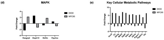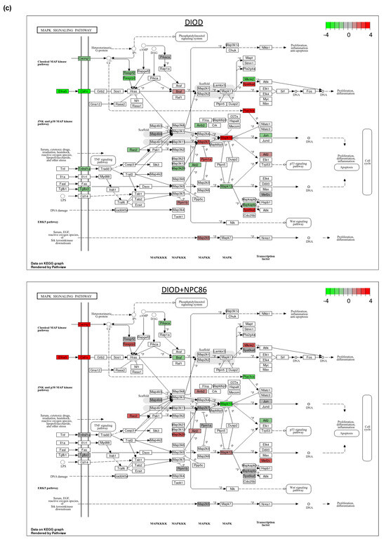 Key insulin signaling genes (Figure 6b), such as INSR, IRS3, Pik3cb, and Sorbs1, were significantly upregulated following NPC86 treatment, showing fold changes consistent with improved insulin sensitivity. Gys2 and Pde3b, which were downregulated in DIOD mice, were upregulated following NPC86 treatment, indicating enhanced glycogen synthesis and lipid signaling regulation [27,28]. Notably, Slc2a4 (GLUT4), a critical glucose transporter, showed a significant increase in expression in the NPC86-treated mice compared to that in the DIOD controls, suggesting enhanced glucose uptake capacity in adipose tissue [29]. NPC86 treatment significantly modulated the MAPK pathway, a key regulator of metabolic stress responses (Figure 6c,d). Notably, Rasgrp2 expression was upregulated, suggesting a potential role in enhancing cellular adaptation to metabolic stress [30].